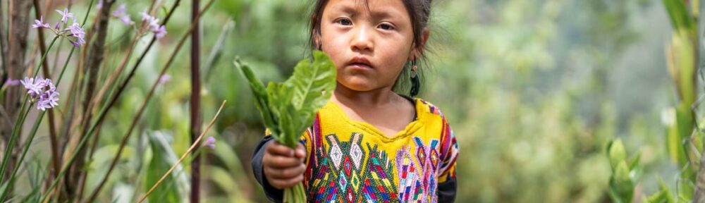 A young girl in Guatemala holds herbs from a kitchen garden.
