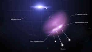 Astronomers predicted the corona’s existence several years ago. “We discovered that if we included a corona in the simulations of the Magellanic Clouds falling onto the Milky Way, we could explain the mass of extracted gas for the first time,” explained Elena D’Onghia, a co-investigator at the University of Wisconsin–Madison. “We knew that the Large Magellanic Cloud should be massive enough to have a corona.”