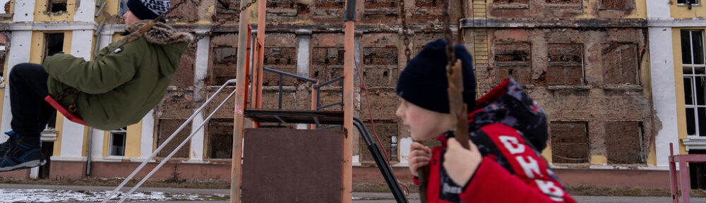 Boys play amidst the ruins of a school in Kharkiv, Ukraine.