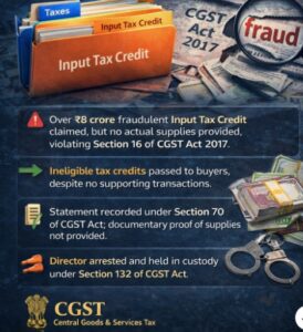 The Anti-Evasion Branch of the Central Goods and Services Tax (CGST), Delhi South Commissionerate, has arrested a company director for allegedly fraudulently availing and utilising Input Tax Credit (ITC) exceeding ₹8 crore, in violation of provisions under the CGST Act, 2017.