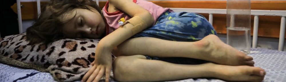 A child suffering from malnutrition lies on a bed in the Patient Society Hospital in Gaza City.