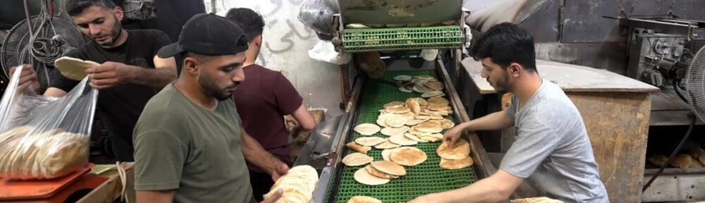 Workers pack freshly baked bread into bags for distribution at Al-Banna Bakery in Deir al-Balah, Gaza.