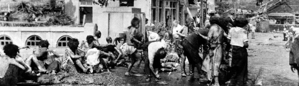 Injured civilians, having escaped the raging inferno, gathered on a pavement west of Miyuki-bashi in Hiroshima, Japan, at about 11 a.m. on 6 August 1945.