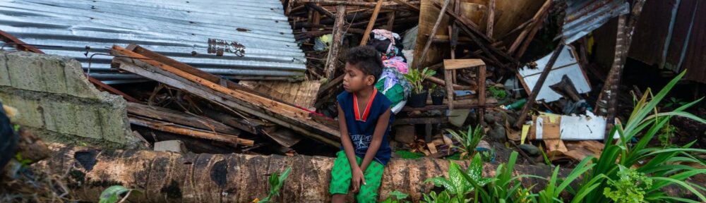 A child from the Badjao Indigenous community in the Philippines sits amid the wreckage left by a typhoon.