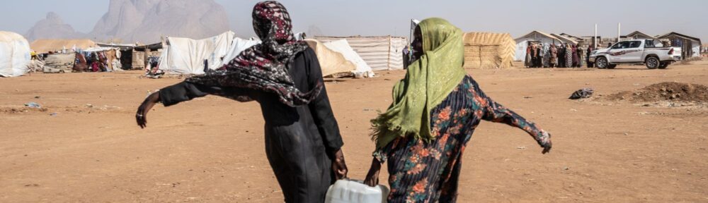 Two young women carry water at a site for displaced people in eastern Sudan.