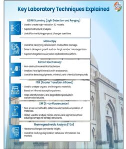 Technology has become an increasingly important pillar in India’s conservation ecosystem, complementing ASI’s traditional practices with tools that improve documentation, diagnostics and long-term preservation. Modern technologies/tools such as LiDAR scanning, GIS based mapping and drone-based surveys etc. are used as per requirement for proper documentation. There has been a growing use of scientific laboratory techniques to study heritage materials, understand patterns of deterioration and determine the most suitable conservation treatments.