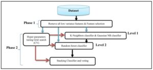 At the heart of the system lies a stacking ensemble classification structure. Base learners consist of K-Nearest Neighbors and Gaussian Naive Bayes algorithms, which feed into a Random Forest classifier serving as the meta-classifier. The Random Forest model is optimized using Grid Search cross-validation to ensure peak performance.