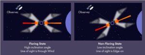 As the disk tilts and shifts, the wind surrounding it moves in and out of the telescope’s line of sight. This leads to periodic changes in brightness, producing flares that repeat but not at regular intervals.