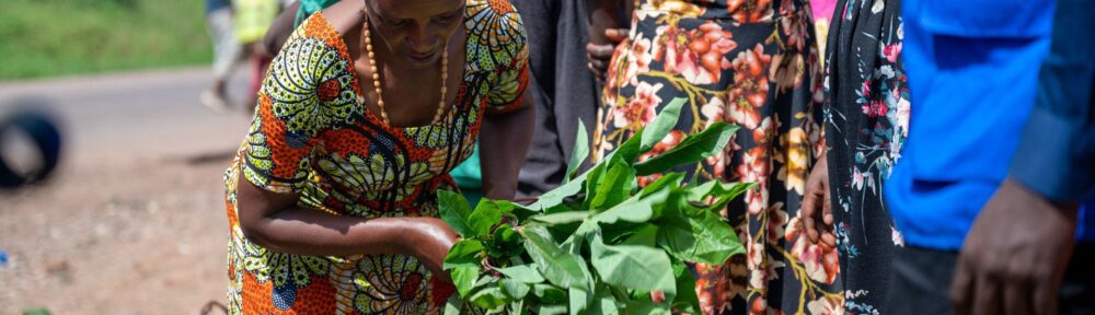 Francoise picks out vegetables to resell to the Congolese traders at the Elakat market in the DRC.