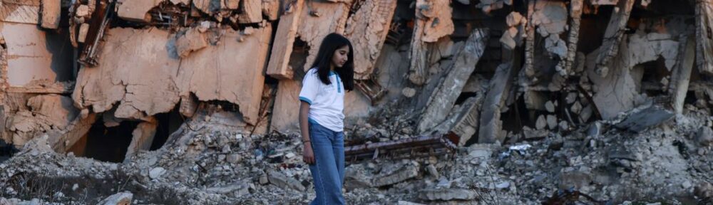 A girl walks amid widespread destruction in Aleppo, Syria, left behind after 14 years of war.