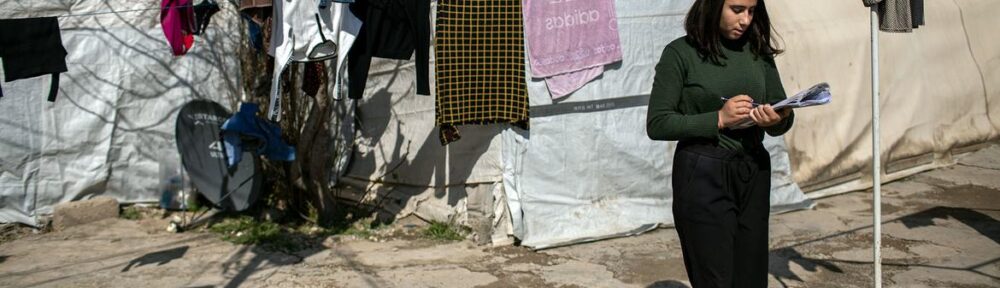A 14-year-old Yazidi girl prepares for an exam in the Shekhan camp for internally displaced persons.