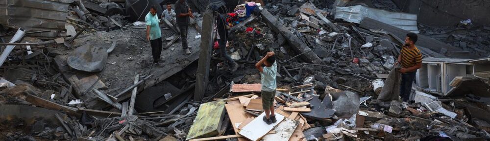 People search through the rubble of a destroyed building in the central Gaza Strip.