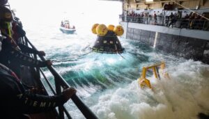 Recovery operations are routinely verified and validated in what is called an underway recovery test. NASA and Navy teams board a U.S. Navy ship and travel off the coast of San Diego to test retrieving the capsule and getting the crew safely on the ship. In late February 2024, the Artemis II crew joined the recovery team’s eleventh iteration of testing called, URT-11.