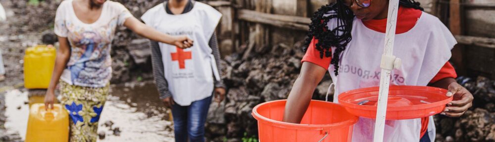 A UNICEF-supported cholera team add chlorine to water collected from a reservoir in Goma, in the DR Congo.