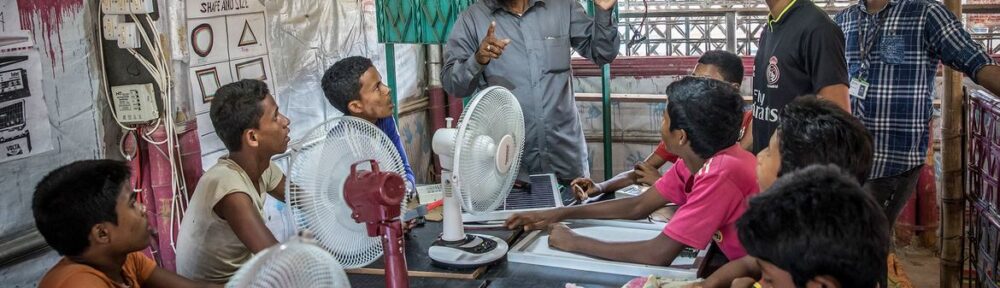Young men from the Rohingya community receive electrician training at a refugee camp in southern Bangladesh.
